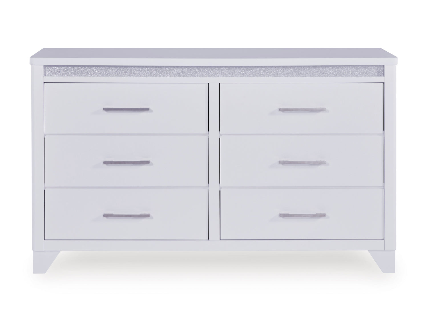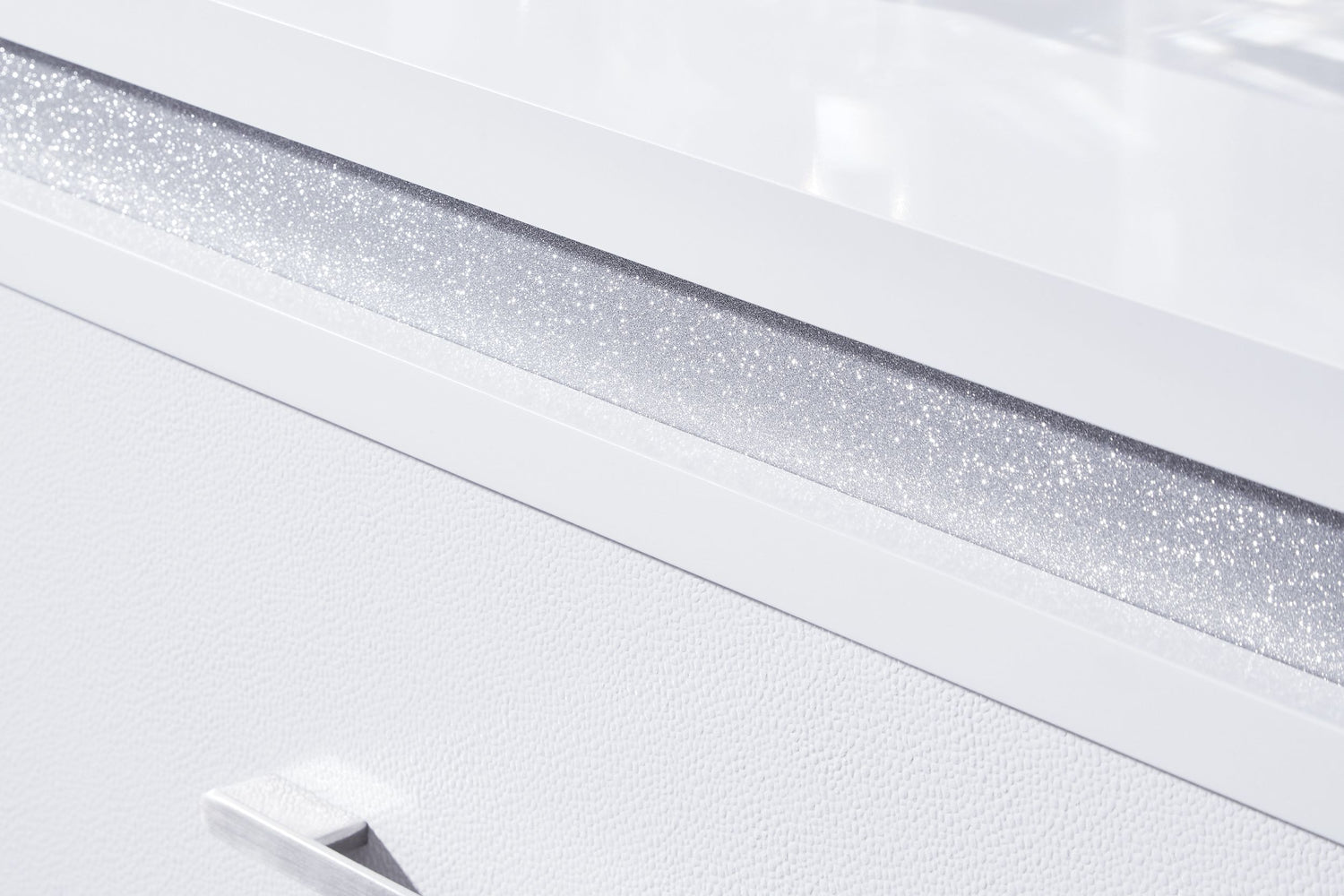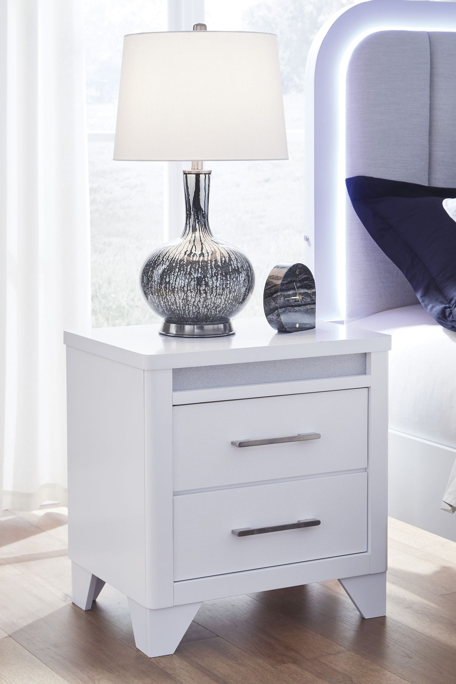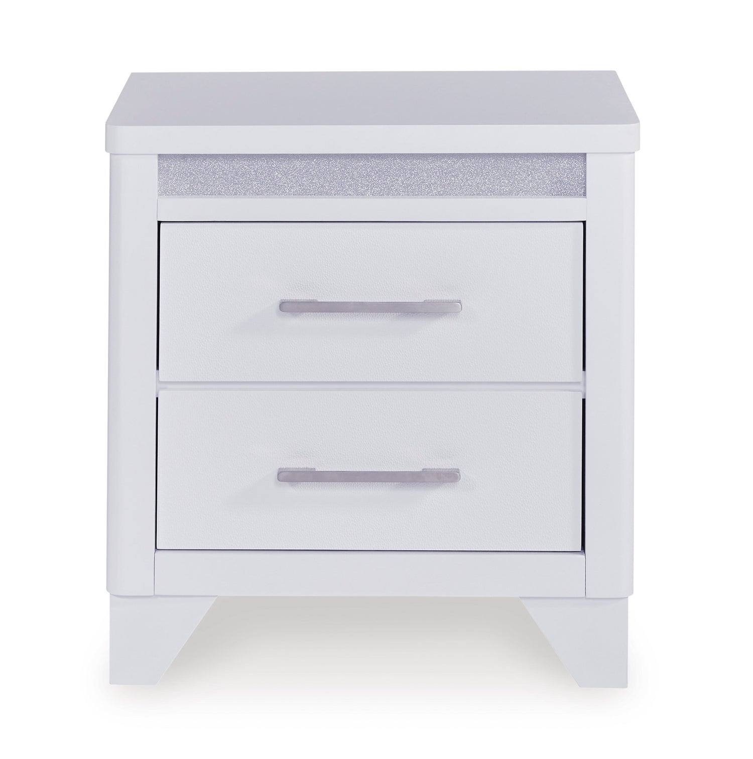 • Two-Drawer Nightstand: Includes inset acrylic glitter accents, textured drawer fronts, and horizontal metal pulls for a contemporary look.