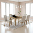 The centerpiece is an innovative Butterfly Extension Table, designed with a hidden leaf that allows you to expand your seating capacity effortlessly. Whether you are hosting a large holiday brunch or an intimate family dinner, this table adapts to your needs. The set is beautifully finished with six ergonomically designed side chairs upholstered in a soft, cream-colored linen-like fabric, providing a high-end look with exceptional comfort.