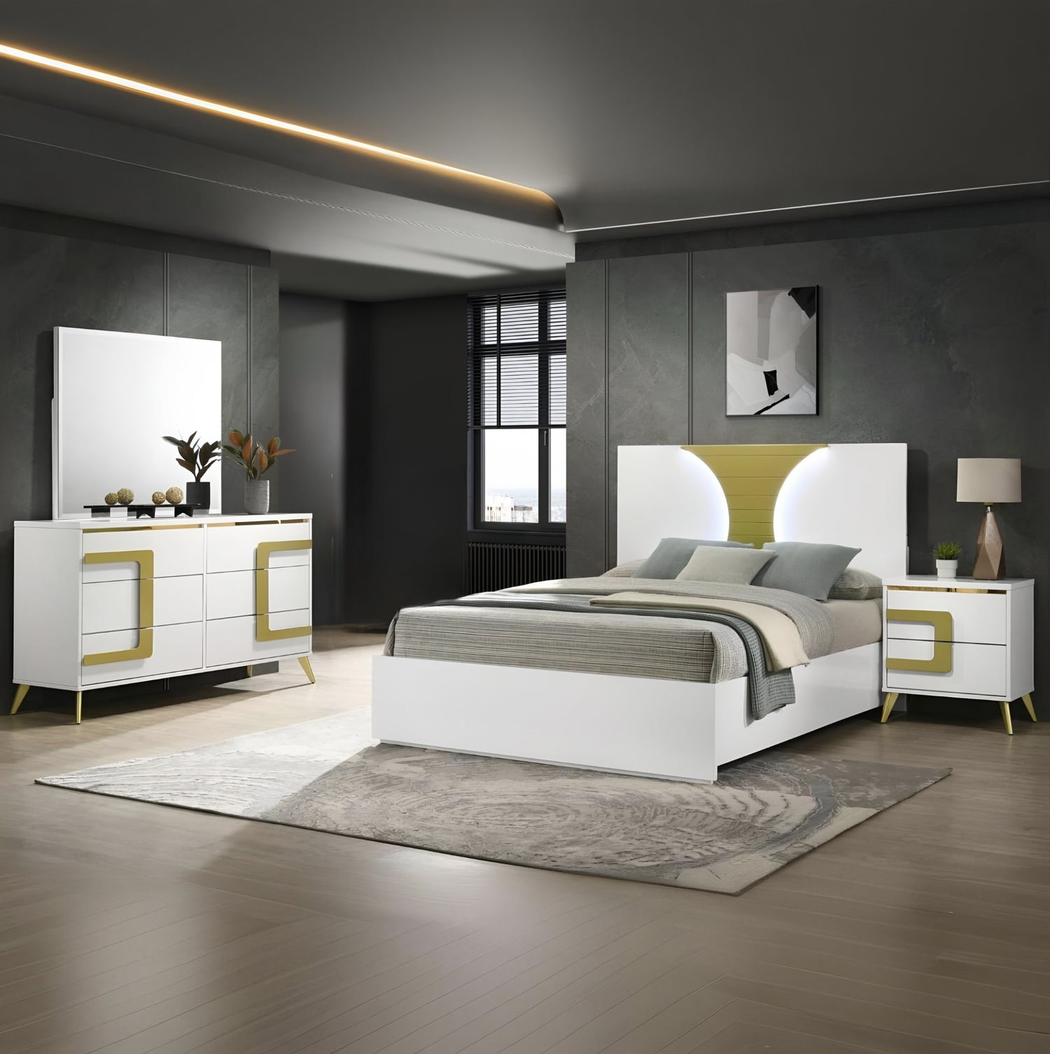 Summer 4-Piece Bedroom Set - Furniture Outlet - White / Gold / 4 Pc. Bed, Nightstand, Dresser, Mirror / Queen is backordered and will ship as soon as it is back in stock.