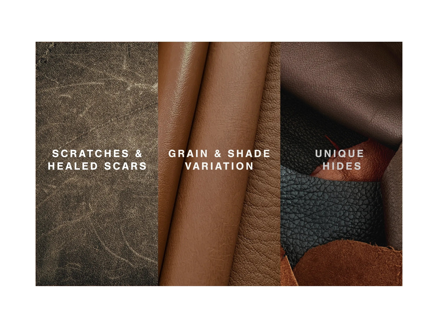 Due to its natural origin, real leather can show individual characteristics such as healed scars, growth marks, grain variation and shade variation. These natural variations make each hide unique and do not detract from the wearing qualities of leather.
