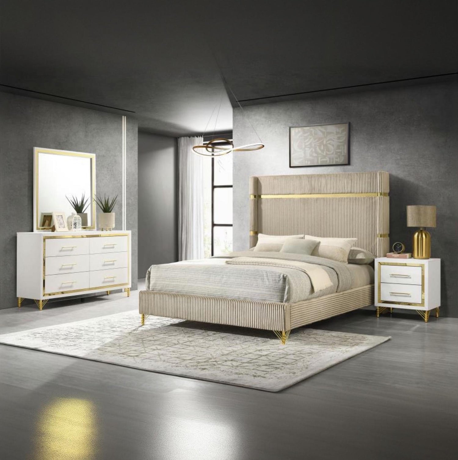 Effortlessly blending inviting softness and timeless sophistication, this four-piece modern bedroom set creates a rich but inviting ambiance. It centers on a stylish upholstered bed that pairs beige upholstery with a fluted look, creating impressive texture and dimensionality. Its on-trend silhouette encourages an open, airy feeling, complete with understated rails and footboard. The set includes a two-drawer nightstand and six-drawer dresser and mirror combination, creating a stylish set that brims with elegance. The cases features a bright white finish, while each piece is trimmed in gold, offering gleaming warmth and sophistication.